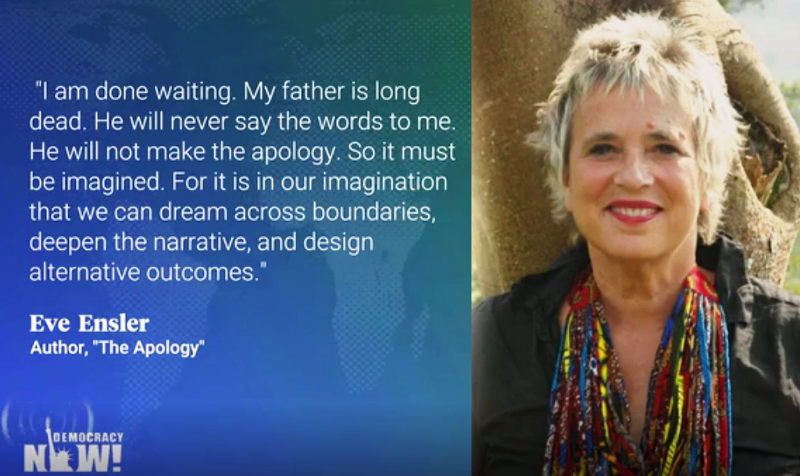 AMY GOODMAN: Eve Ensler’s father sexually and physically abused her throughout her childhood beginning when she was just five years old. His abuse caused immeasurable physical and emotional damage but he never apologized for his behavior. So decades after the abuse and his death, Eve Ensler decided to write an apology for him. The result is a stunning new book in which Eve writes to herself from her father’s perspective. In the book’s introduction, she writes, “I am done waiting. My father is long dead. He will never say the words to me. He will not make the apology. So it must be imagined. For it is in our imagination that we can dream across boundaries, deepen the narrative, and design alternative outcomes.” Eve Ensler is the well-known author of The Vagina Monologues. Over 20 years ago in 1998, she launched V-Day, an international movement to stop violence against women and girls. She has dedicated her new book to every woman still waiting for an apology.